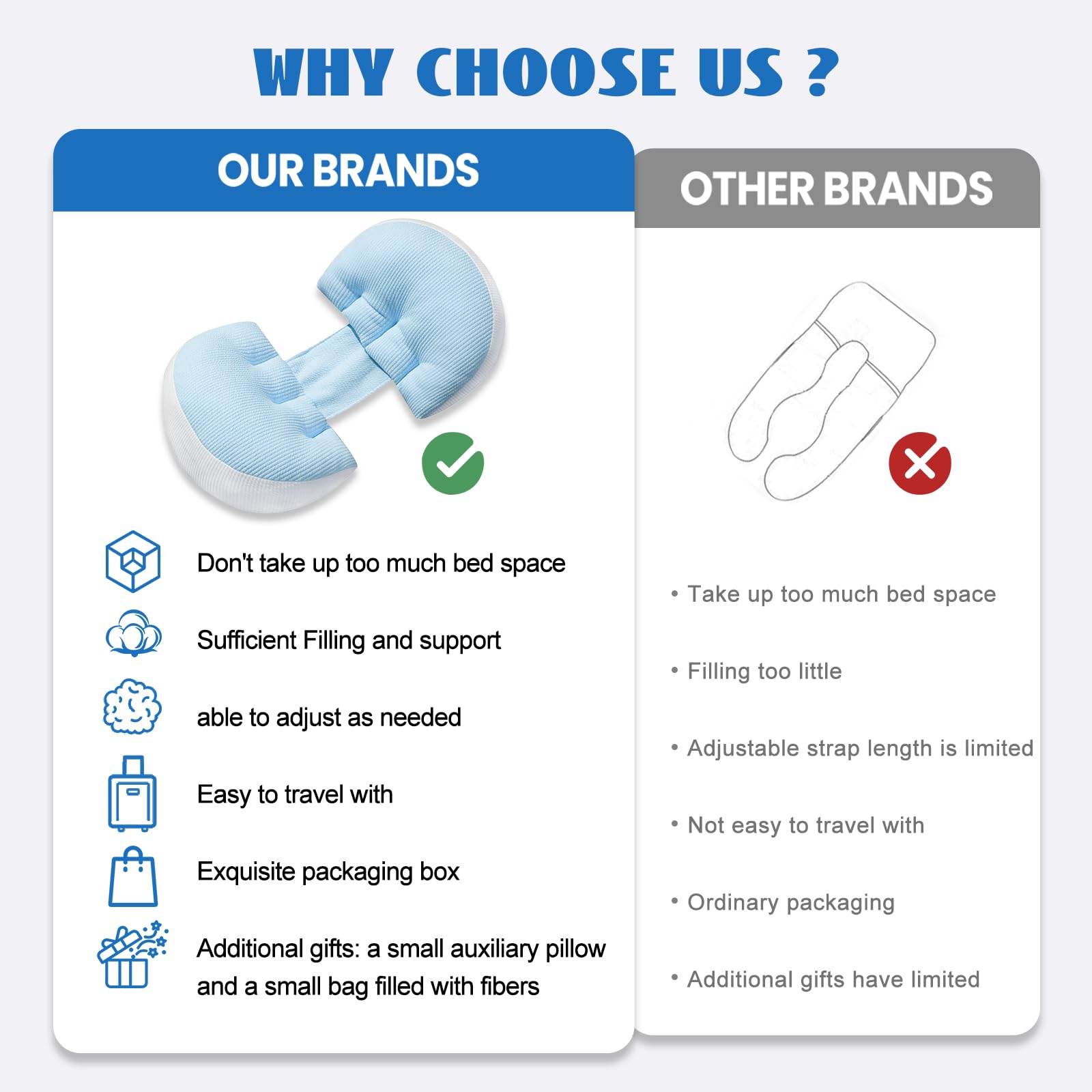 What sets this pillow apart? Its compact size means it doesnt take up too much bed space, yet still delivers full-body support. The included auxiliary pillow adds extra comfort for neck or leg support. Its also easy to pack fits neatly into a suitcase, making it ideal for travel, hospital stays, or visits to family.
